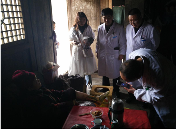 义诊活动现场,专家们为前来求医问诊的村民把脉、量血压,耐心地解答他们提出的各种医疗咨询,提出治疗建议。当义诊医疗队听说二组的张春林脚被烫伤不能行走时,他们以送医上门的形式,提供零距离服务。张春林烫伤的脚里面的肉已绽开,有些肉已经腐烂,很肿,异味很重。专家们细心查看,认真研判,提出治疗预案,并和患者家属详细交流,留下电话号码,温暖的举动让患者及家属感动。