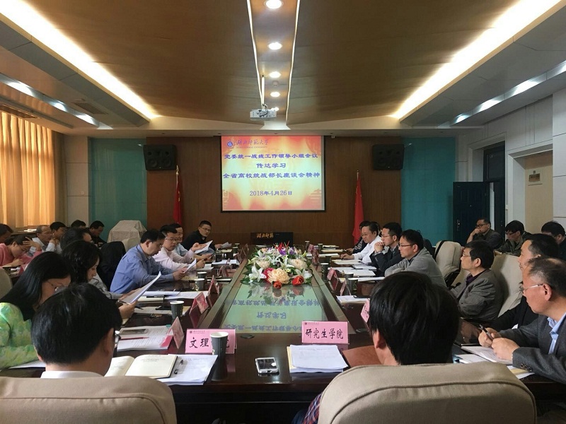 4月26日下午,湖北师范大学召开党委统一战线工作领导小组会议,传达学习全省高校统战部长座谈会精神,研究贯彻落实意见。党委副书记、校长李宏出席会议并讲话,党委常委、副校长、统战部部长雷儒金主持会议,党委常委、副校长李开灿,学校党委统一战线工作领导小组成员单位主要负责人参加会议。