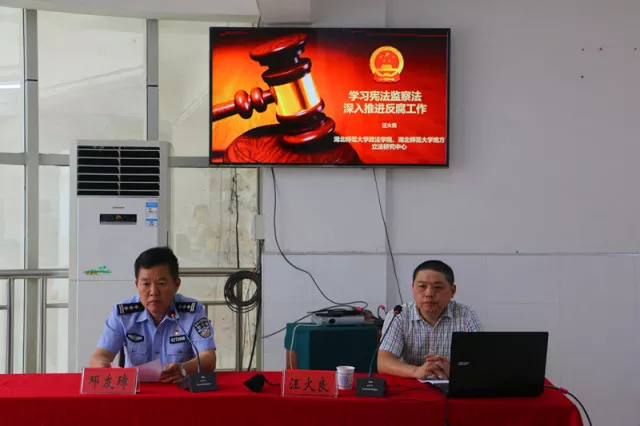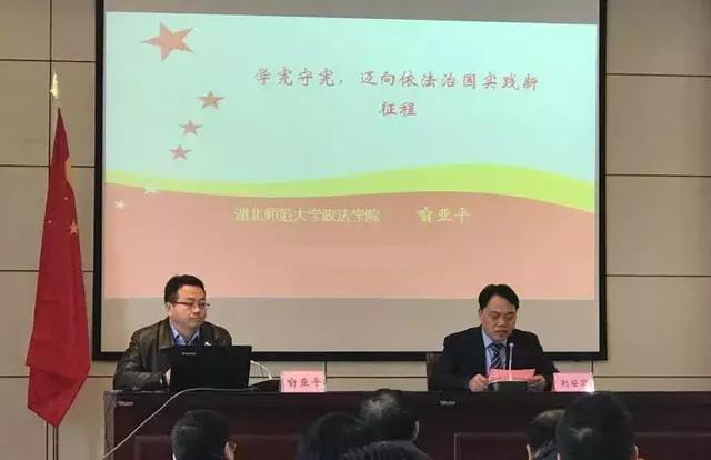 为全面宣传普及《中华人民共和国宪法》《中华人民共和国监察法》,提高社会服务能力,湖北师范大学“同心·法律服务基地”受邀选派多位博士教授为黄石市各县(市、区)、部委办、学校等单位做宪法修正案、监察法主题宣讲。他们从中国近现代宪法的产生、宪法的作用、党的十九大与推进合宪性审查工作、当前我国关于宪政的思潮等方面进行深刻的阐述,系统解读宪法修改和《监察法》出台的时代背景、重大意义、修改过程和主要内容等。