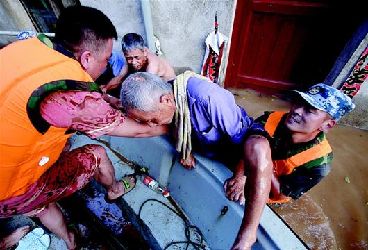 图为:7月21日,救援官兵转移受困洪水的应城杨河镇等地民众。( 陈迹 郑毅 摄)