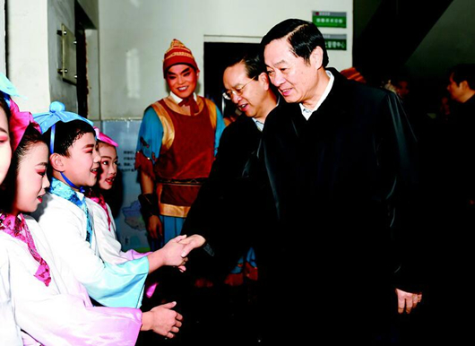 图为:11月17日,中共中央政治局委员、中央书记处书记、中宣部部长刘奇葆在省委书记蒋超良陪同下,考察襄阳市昭明小学戏曲进校园工作,与学生戏曲爱好者亲切握手。(陈迹 摄)