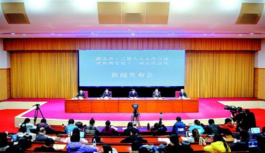 图为:2017年1月19日,省两会第二场新闻发布会——“全省灾后恢复重建及保障群众生产生活情况通报”新闻发布会在武汉洪山礼堂举行。(孙文 摄)