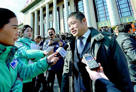 图为:5日,湖北团胡胜云代表在人民大会堂前接受采访。(张朋 摄)
