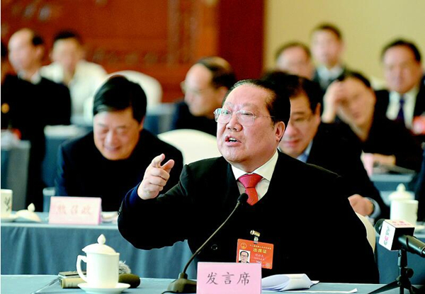 图为3月12日,代表团全体会议上,谭功炎代表建议强化对“老赖”的制裁措施,全力破解执行难。(张朋 摄)