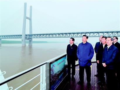 图为:4月25日上午,习近平乘船察看荆江两岸生态环境和发展建设情况。(新华社记者 谢环驰 鞠鹏 摄)