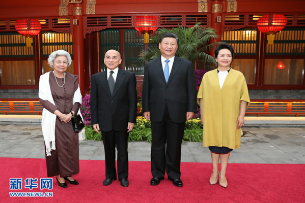 9月19日,在中秋佳节来临之际,国家主席习近平和夫人彭丽媛在钓鱼台国宾馆亲切看望正在北京休养的柬埔寨国王西哈莫尼和太后莫尼列。新华社记者 黄敬文 摄