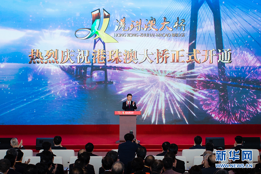 新华社珠海10月23日电(记者霍小光、张晓松、周强)一桥连三地,天堑变通途。港珠澳大桥开通仪式23日上午在广东省珠海市举行。中共中央总书记、国家主席、中央军委主席习近平出席仪式,宣布大桥正式开通并巡览大桥,代表党中央向参与大桥设计、建设、管理的广大人员表示衷心的感谢、致以诚挚的问候。