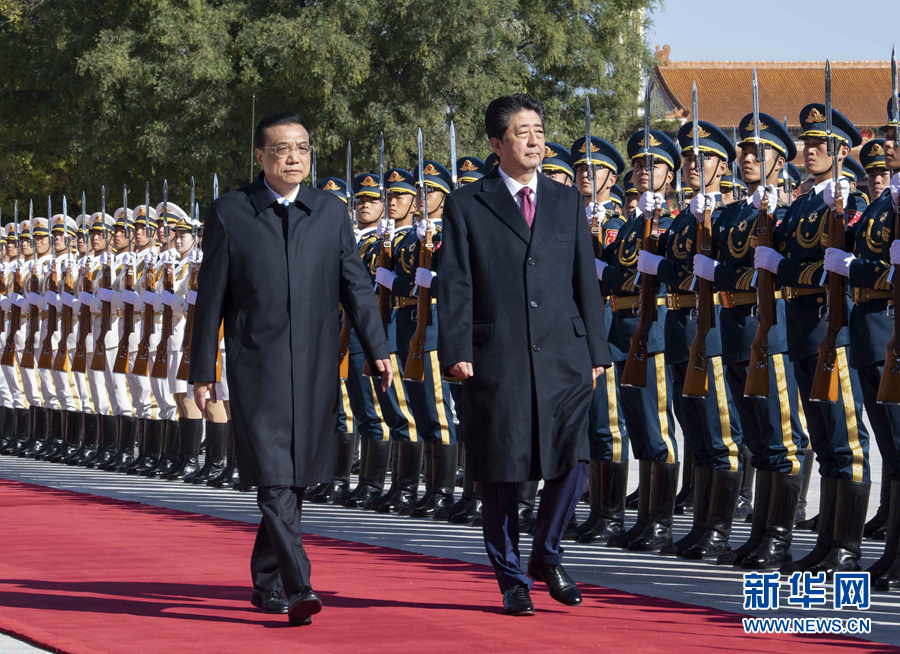 10月26日,国务院总理李克强在北京人民大会堂同日本首相安倍晋三举行会谈。这是会谈前,李克强在人民大会堂东门外广场为安倍晋三举行欢迎仪式。 新华社记者李涛摄